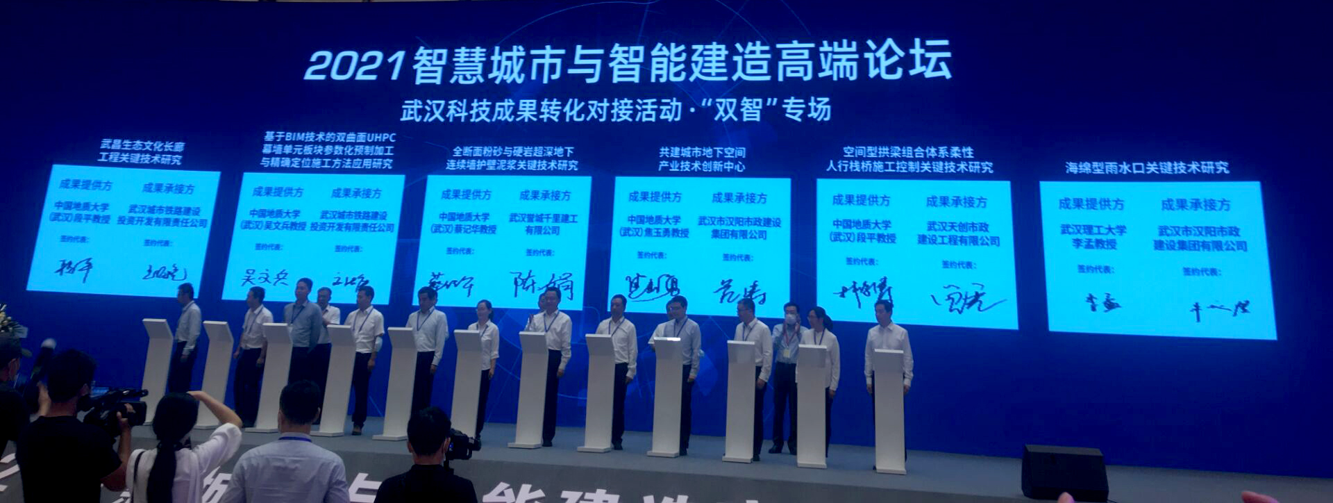 (通讯员:刘浩、张美霞)9月24日,星空平台app_星空(中国)院长焦玉勇教授应邀率队出席2021智慧城市与智能建造(“双智”)高端论坛。开幕式“武汉科技成果转化对接活动 双智专场”上,焦玉勇带领我院蔡记华、吴文兵、林俊涛、刘浩4位老师分别与武汉市汉阳市政建设集团有限公司、武汉市誉城千里有限公司、武汉市城市铁路建设投资开发有限公司签订了共建技术创新中心、人才培养与科技成果转化合作协议。我院与武汉市相关部门和企业开展深度合作,将为湖北省“一主引领、两翼驱动、全域协同”的区域发展布局,和武汉建设“宜居城市、韧性城市、智慧城市、绿色城市、人文城市”的重大需求提供技术和人才支持。