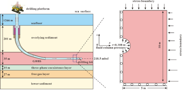 鉴于此,中国地质大学(武汉)星空平台app_星空(中国)宁伏龙教授团队根据南海神狐海域第一次试采站位的地质资料,构建了水合物储层水平井钻进状态模型(图1)。详细研究了不同钻井液性能、水合物饱和度以及束缚水饱和度对钻进过程中井筒状态的影响规律。并在此基础上,讨论了井筒内二次水合物生成的潜在区域以及低渗泥皮形成对井壁稳定的影响。
