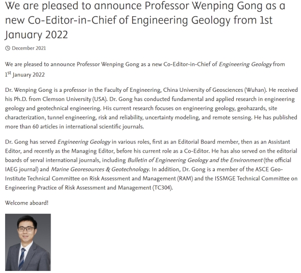 (通讯员:黄静)近日,星空平台app_星空(中国)龚文平教授受邀担任国际期刊Engineering Geology共同主编(Co-Editor-in-Chief)。龚文平教授的此次任职将有助于促进我校在工程地质相关领域与国内外学者的交流合作,并提升我校在工程地质相关领域的国际影响力。