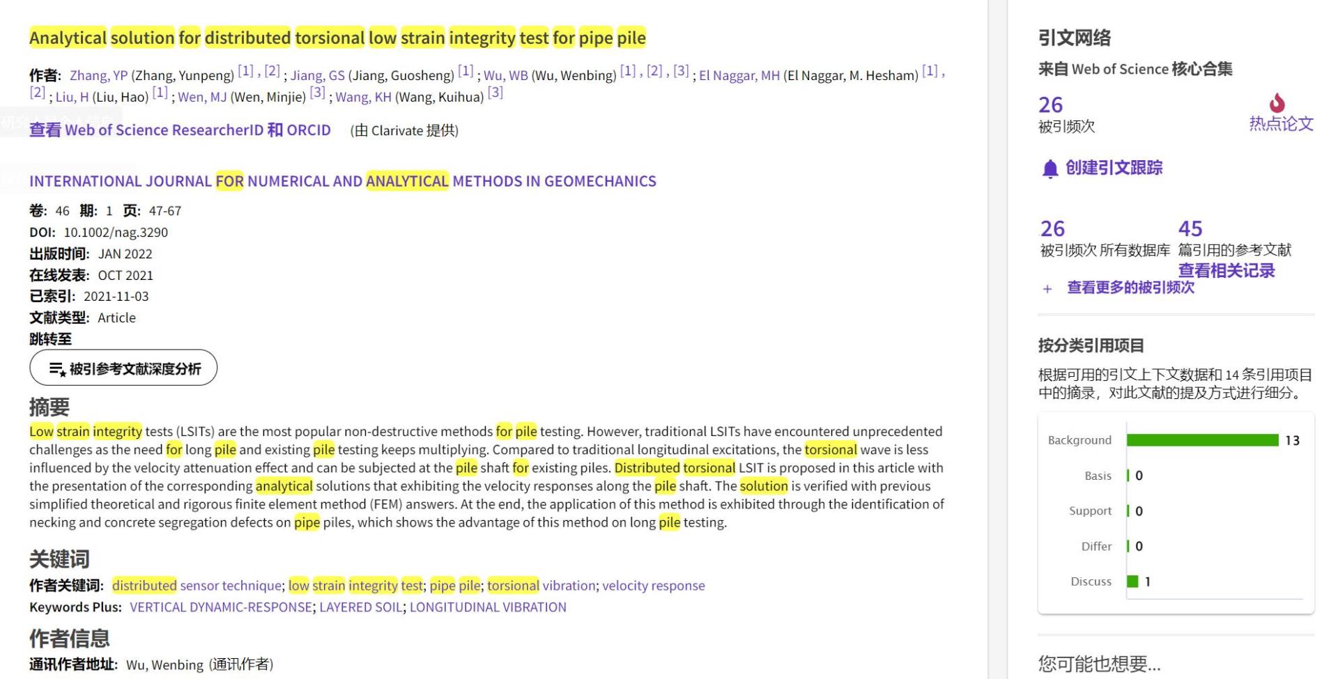 (通讯员 黄静)根据2022年9月基本科学指标数据库(Essential Science Indicators,简称ESI)最新数据显示,星空平台app_星空(中国)勘察与基础工程系吴文兵教授团队于2021年在国际岩土工程数值计算权威期刊International Journal for Numerical and Analytical Methods in Geomechanics上发表的学术论文“Analytical solution for distributed torsional low strain integrity test for pipe pile”入选ESI热点论文(Hot Paper)。该论文第一作者为2020级博士研究生张云鹏,通讯作者为吴文兵教授,中国地质大学(武汉)星空平台app_星空(中国)为第一署名单位。