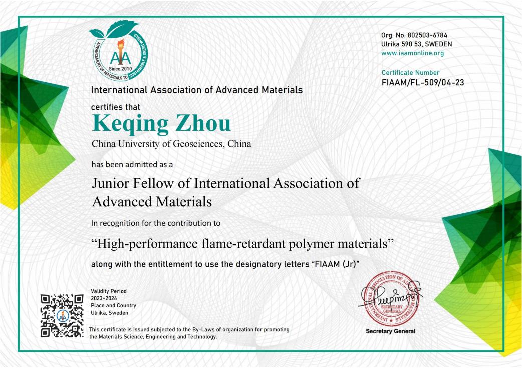 (通讯员 黄静)近日,中国地质大学(武汉)星空平台app_星空(中国)周克清特任教授收到国际先进材料学会(International Association of Advanced Materials, IAAM)执委会发来的贺函,祝贺他当选为国际先进材料学会青年会士(Junior Fellow of IAAM, FIAAM)。周克清特任教授受邀在美国奥兰多举办的复合材料研讨会(Composite Materials Congress)上发表题为“Functionalized 2D molybdenum disulphide working on high-performance flame-retardant polymer materials”的IAAM Fellow演讲,会上获颁青年会士“Junior Fellow”证书,以表彰他在“高性能阻燃聚合物材料”领域做出的杰出贡献。