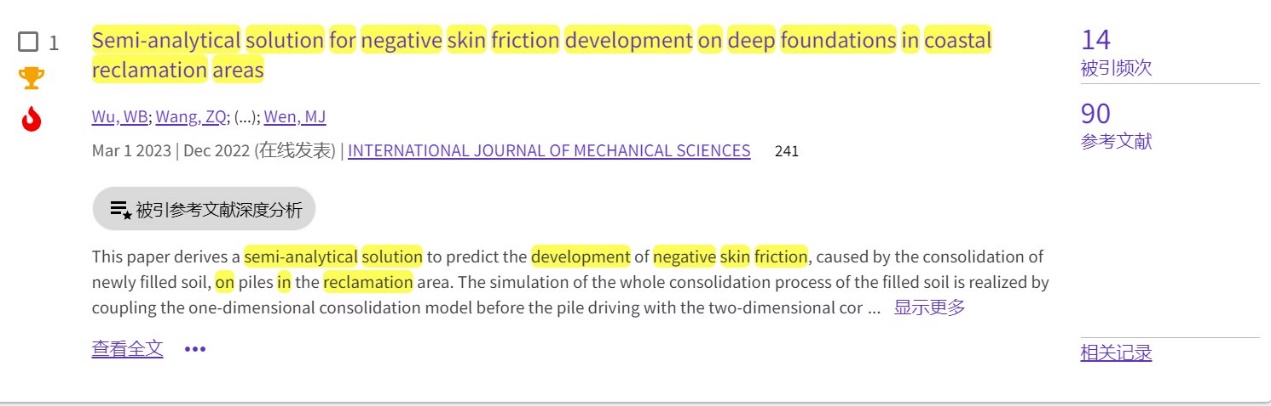 (通讯员 黄静)根据2023年7月基本科学指标数据库(Essential Science Indicators,简称ESI)最新数据显示,星空平台app_星空(中国)勘察与基础工程系吴文兵教授团队于2023年在国际工程力学领域权威期刊International Journal of Mechanical Sciences(IF: 7.3, 中科院一区TOP)上发表的学术论文“Semi-analytical solution for negative skin friction development on deep foundations in coastal reclamation areas”同时入选ESI热点论文和高被引论文。该论文第一作者为吴文兵教授,第二作者为勘察与基础工程系王宗琴硕士,中国地质大学(武汉)星空平台app_星空(中国)为第一署名单位。