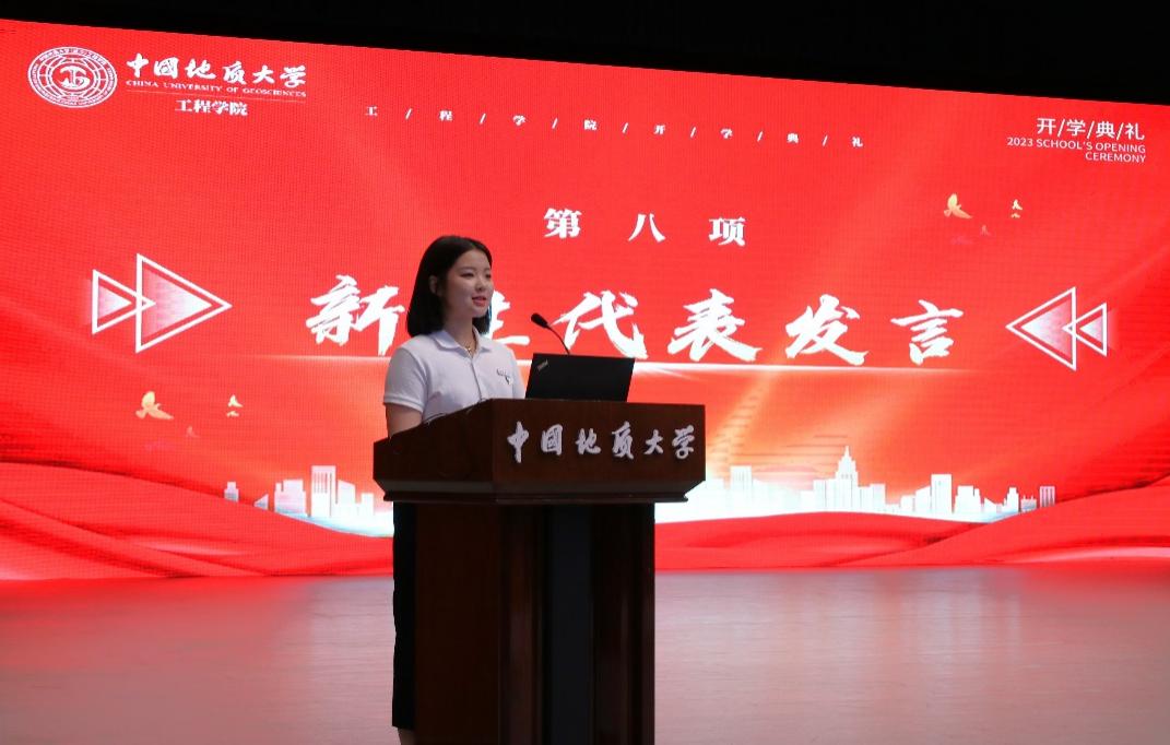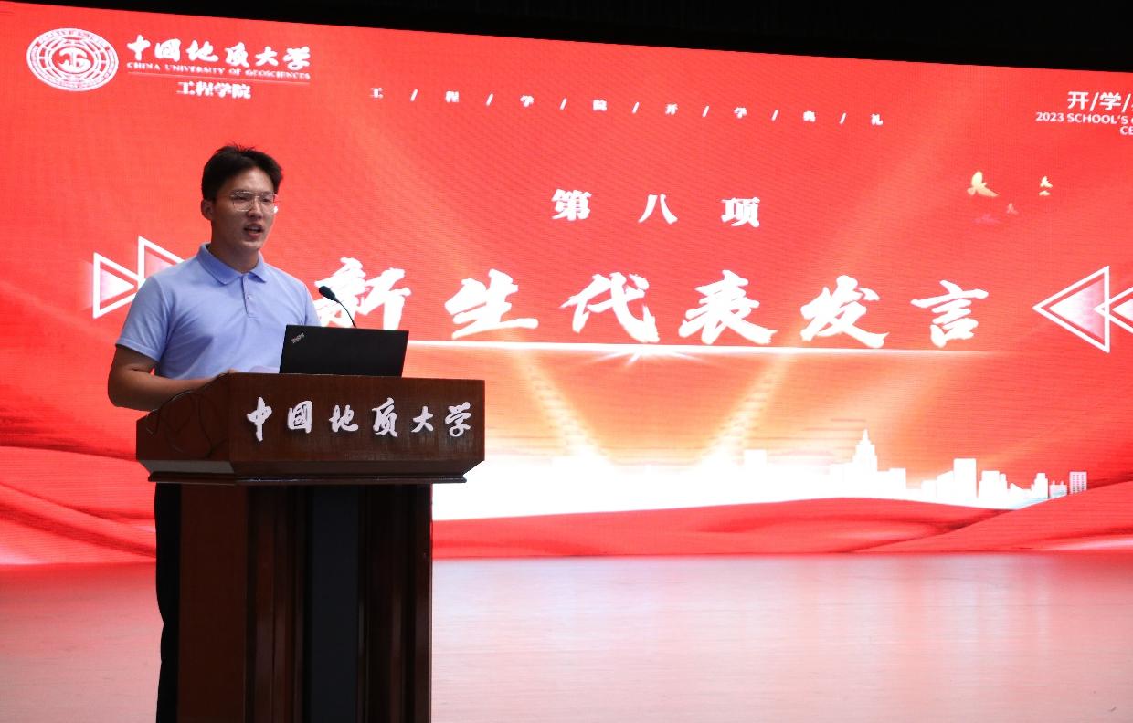 2023级05D231班张高涵同学作为本科生新生代表发言。他说,在长辈厚重岩土气息的熏陶下,自己终于如愿考进地质大学,加入星空平台app_星空(中国)。他对开学报到以来学院领导老师给予的教育关怀表示感谢,对军事训练当中空军预警学院教官对自己坚忍毅力和良好作息的打造由衷感激,他立志与其他505名本科新生同学一道,以强国建设、民族复兴的时代号召为号角,以“品德高尚、基础厚实、专业精深、知行合一”的成才目标为向导,直挂云帆,乘风破浪,早日成为德智体美劳全面发展的中国特色社会主义事业的建设者和接班人。