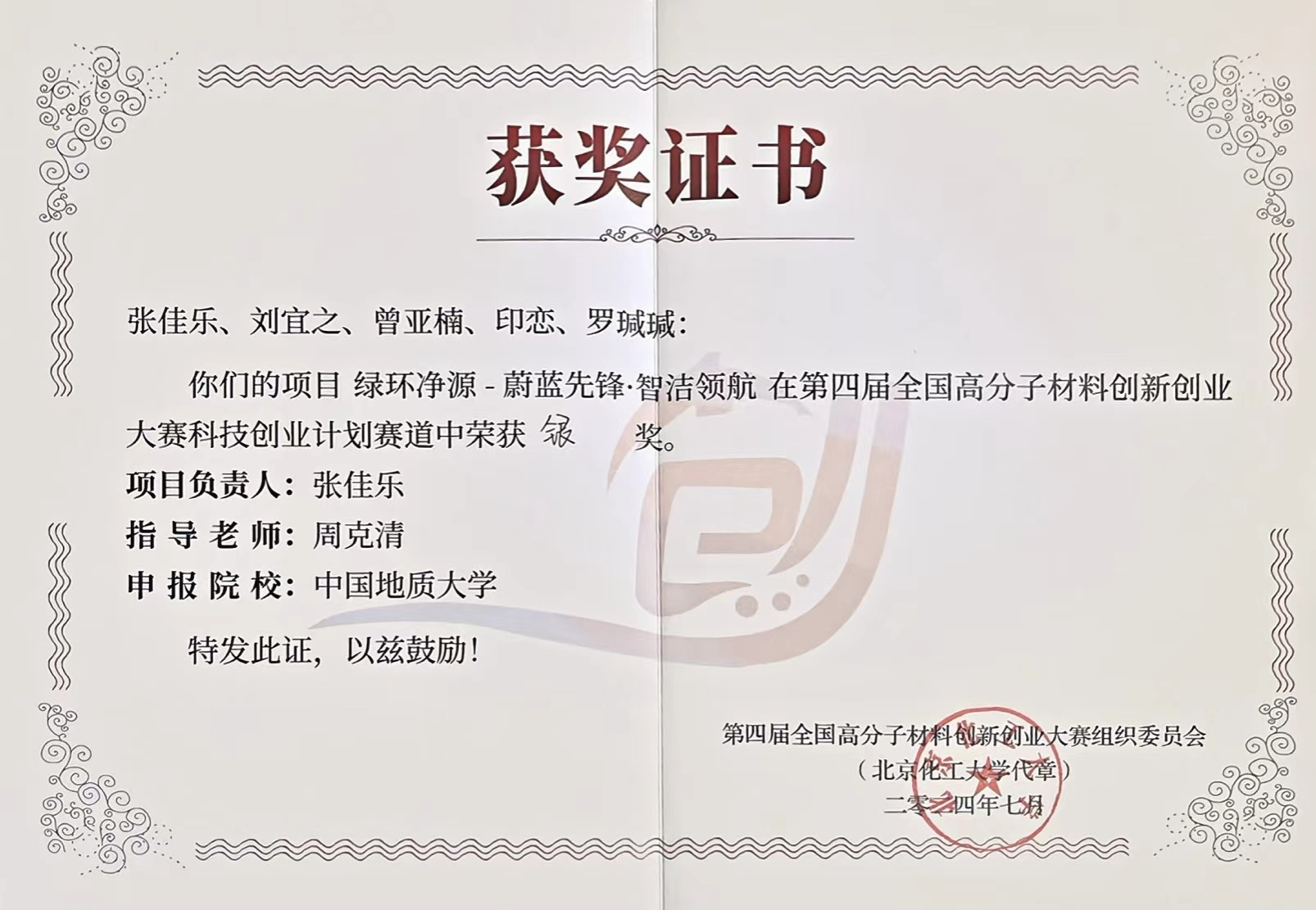 周克清特任教授指导的《绿环净源-蔚蓝先锋·智洁领航》项目荣获第四届全国高分子材料创新创业大赛科技创业计划赛道银奖。项目团队成员包括星空平台app_星空(中国)安全工程系本科生张佳乐、刘宜之、博士研究生生印恋、罗瑊瑊和马克思主义学院本科生曾亚楠。