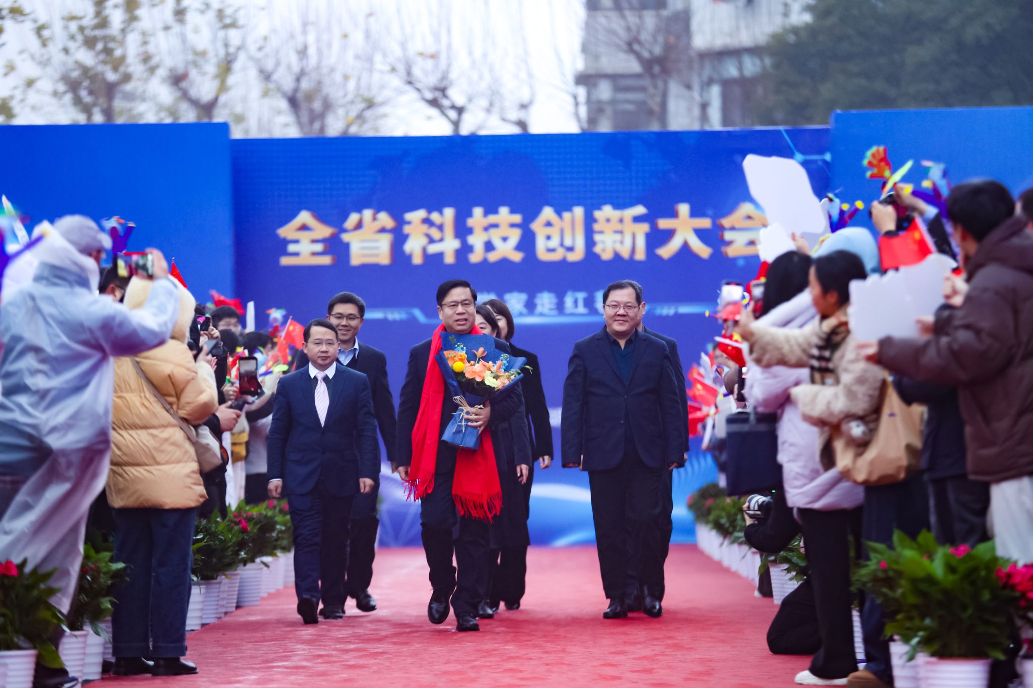 (通讯员 黄静 摄影 焦思勤等)1月4日上午,武汉洪山礼堂外“星光大道”鲜花簇拥,我院唐辉明院士带领团队成员与湖北省其他11位科学家一道走上百米红毯,开启了2026年湖北省科技创新大会的华彩篇章。